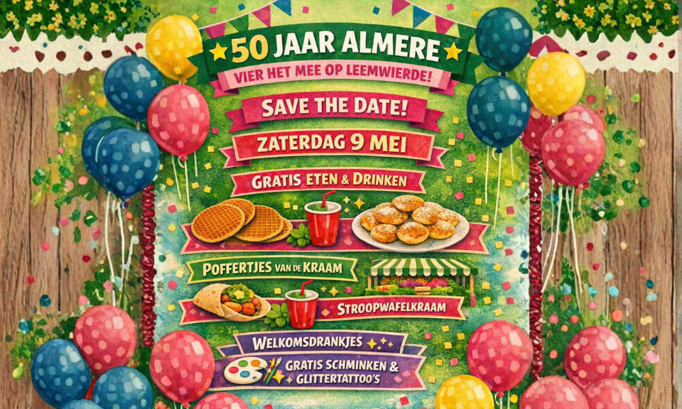 Tussen 11.30 en 15.30 uur is iedereen van harte welkom om samen 50 jaar Almere te vieren tijdens een gezellige middag voor jong en oud.