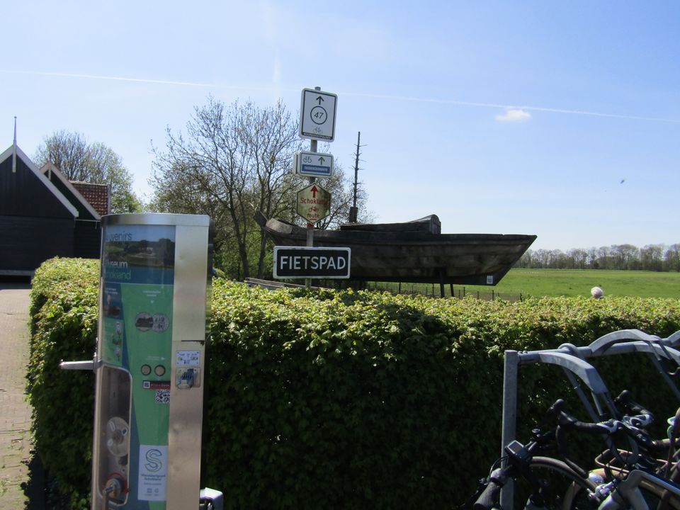 Ook een fiets huren bij Museum Schokland? Reserveer via kassa@museumschokland.nl.Die fiets kan ik ophalen bij de museumwinkel, waar ik ook een routekaartje meekrijg. De fietsroute over Schokland is ongeveer tien kilometer lang, wat je bij een stevig fietstempo in een uurtje makkelijk kunt doen. Maar ja, er valt onderweg zoveel te zien dat we regelmatig even afstappen om iets te bekijken en te fotograferen. En te lezen, want bij veel bezienswaardigheden staan interessante informatiepanelen, die de historie van Schokland toelichten. Zodoende wordt een korte fietsroute toch al gauw middagvullend. Geen straf met dit weer en met alles wat we onderweg zien en leren.