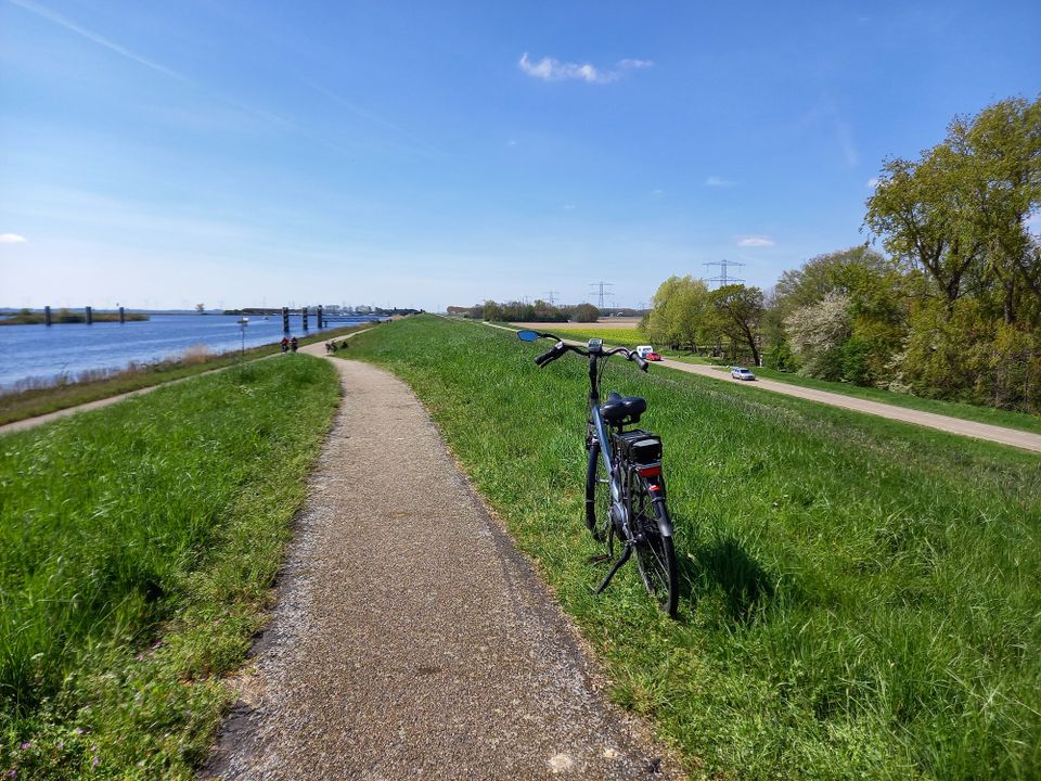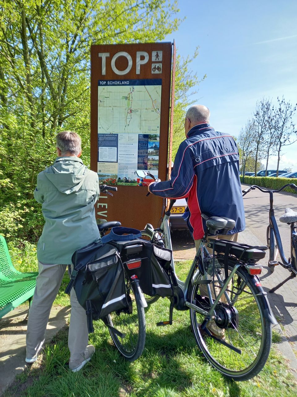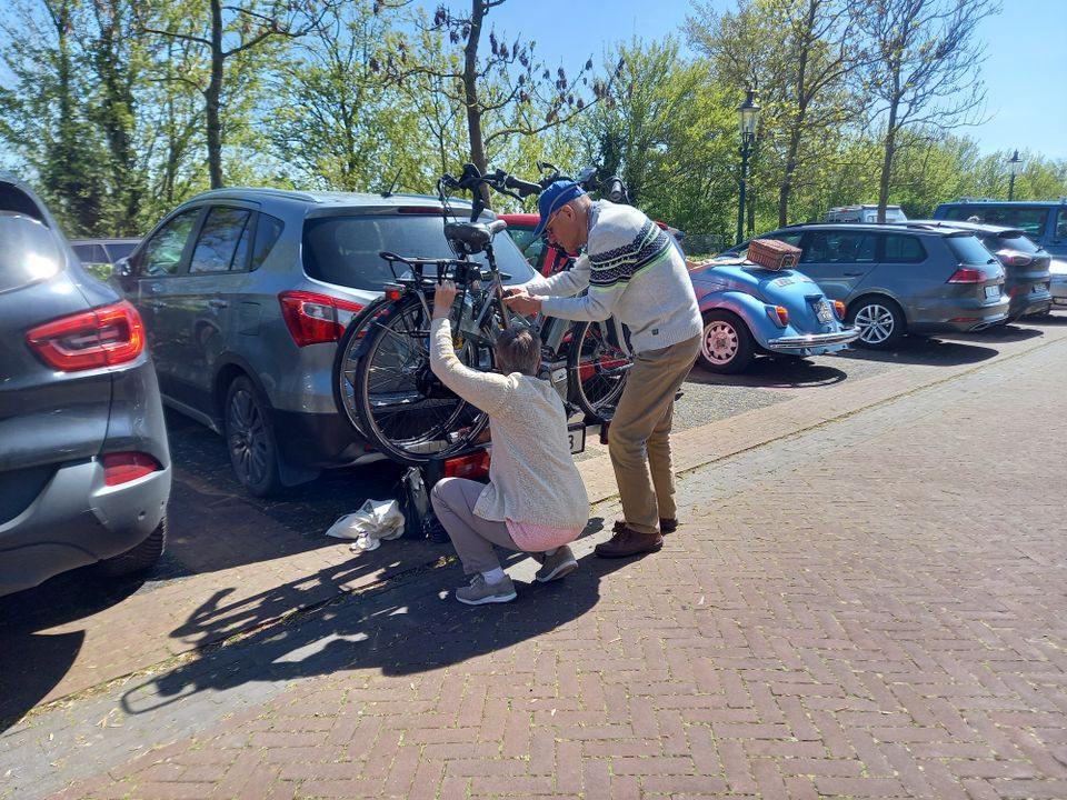Mijn ouders fietsen vaak en veel, sinds een jaar of tien op elektrische fietsen, maar Flevoland kennen ze nog niet zo goed. Dus hebben ze hun e-bikes op de fietsendrager van hun auto gezet en pikken ze mij onderweg op om verder samen naar Museum Schokland te rijden, waar ik voor mezelf een fiets heb gehuurd. Ideaal dat dat daar kan, want als je geen fietsendrager hebt, of als daar minder fietsen op passen dan je gezelschap groot is, kun je alsnog een rondje over Schokland fietsen. En dat ook nog eens voor het zeer schappelijke bedrag van € 3,50 per fiets per uur, dus daarvoor hoef je het echt niet te laten.