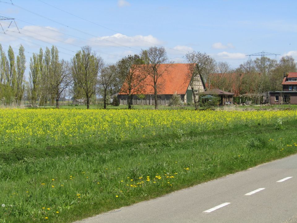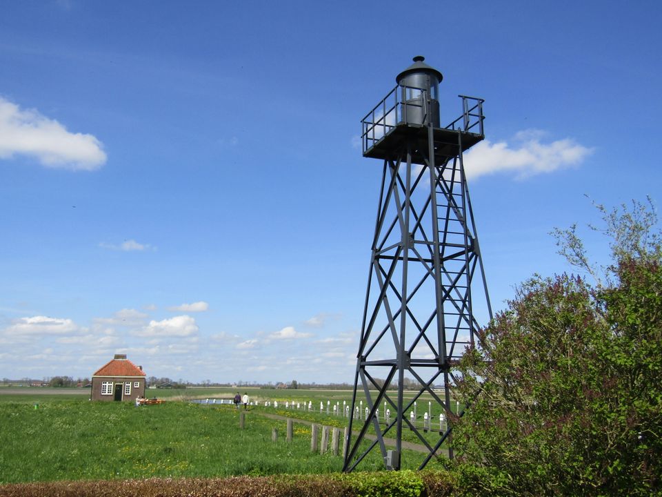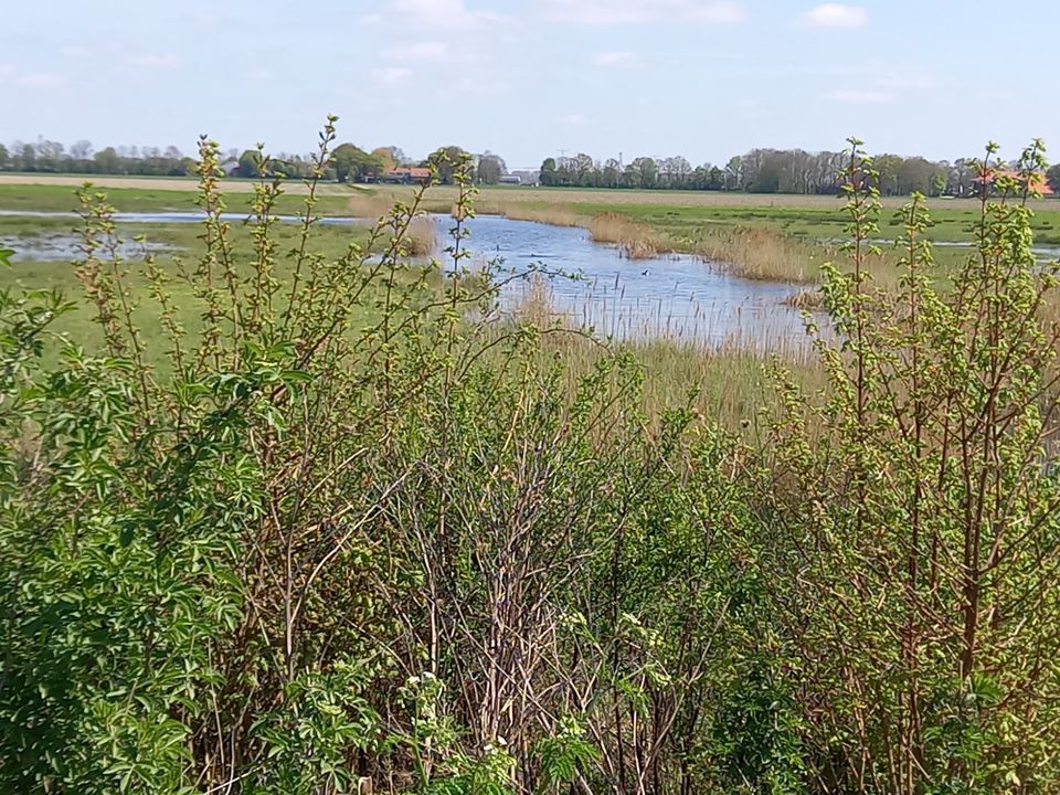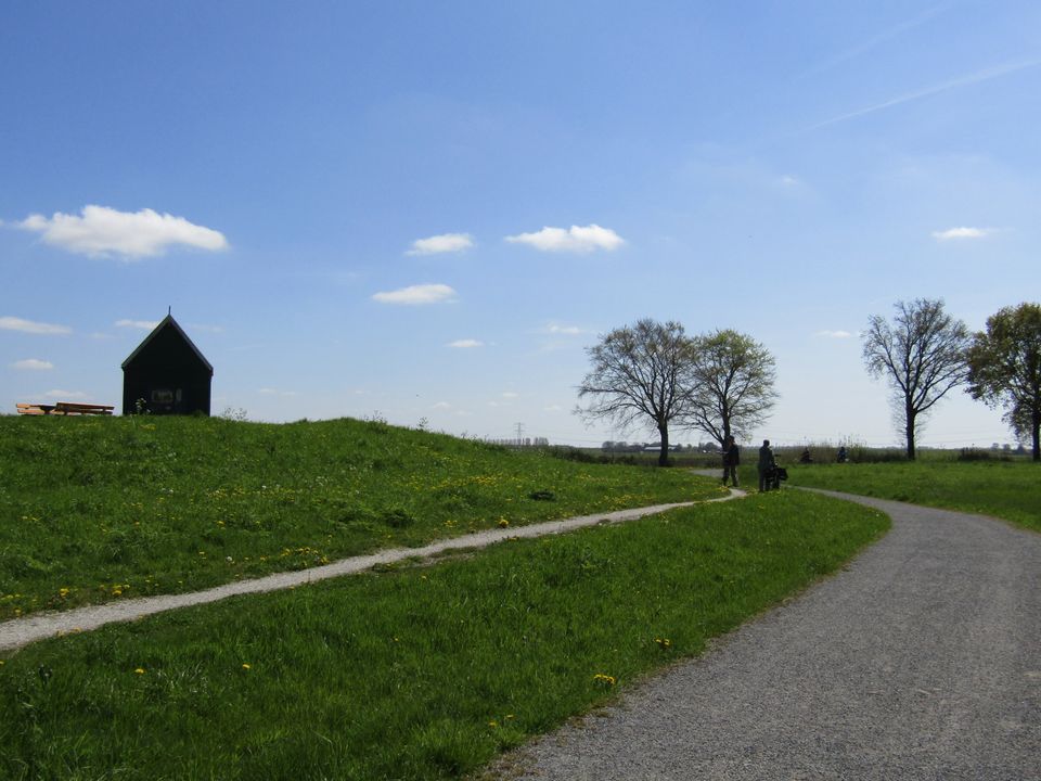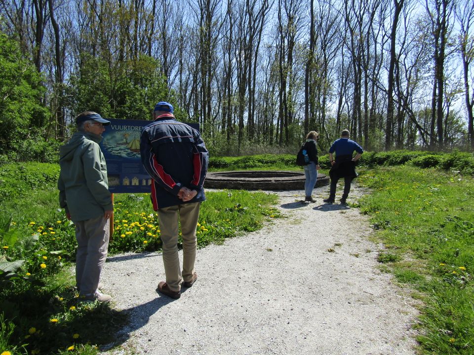 Maar het mooiste van onze fietstocht is nog wel dat het landschap zo ontzettend gevarieerd is. En dat op zo’n korte route! We fietsen langs een terp met een gereconstrueerd houten huisje, langs een drassig en moerasachtig stuk land waar de watervogels zich goed thuis voelen, langs de fundamenten van een middeleeuwse kerk en van een vuurtoren, langs akkers en grasvelden én door het Schokkerbos, waar het groen alweer de overhand neemt en de vogels luidkeels fluiten en zingen. Tsja, het is mei, dus de natuur groeit, bloeit en boeit. En op de fiets heb je alle tijd om daar onderweg van te genieten.