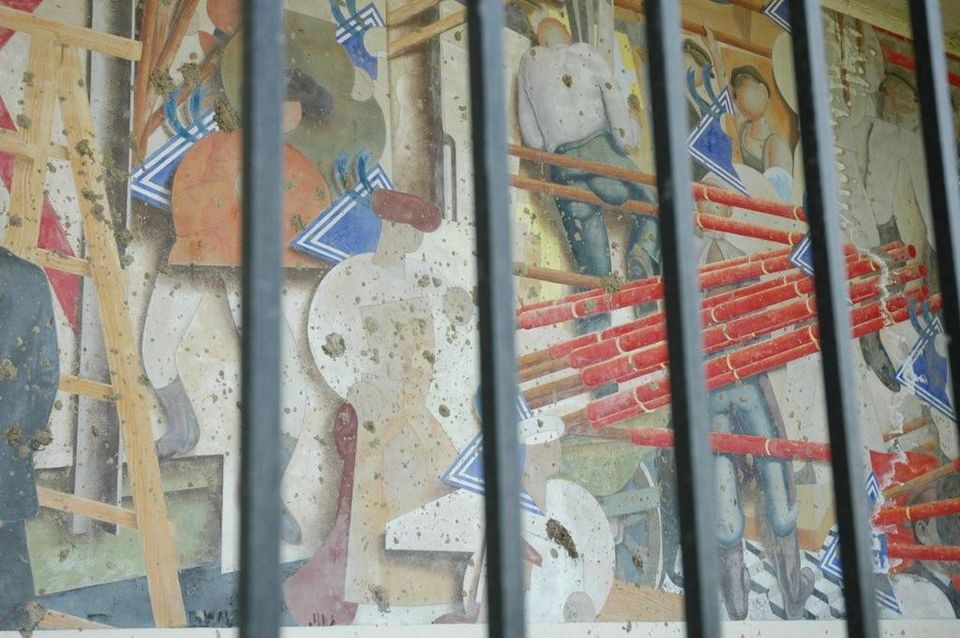 Kunstenaar: Jan van de Pavert. Muurschilderingen zijn door de geschiedenis heen gebruikt om te vertellen, te versieren, ontevredenheid te uiten, de lezer op te roepen. In de titel van het werk liggen de uitgangspunten voor de kunstenaar besloten. Hier mengt hij historie en schilderkunst met elkaar. Hij verwijst met de rode kruisvormige motieven naar de opkomst van de abstracte kunst in Rusland. Anderzijds zijn de stijl, de symbolen en de figuren op de fresco afgeleid van Russisch-communistische propagandamiddelen uit het begin van de vorige eeuw.